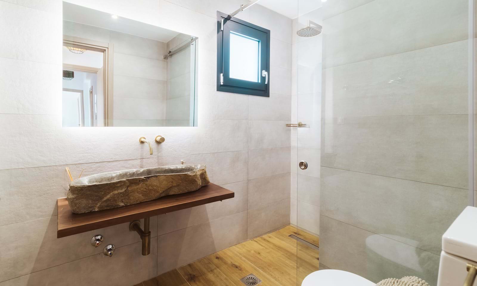 The lower level offers four further bedrooms, designed as peaceful sanctuaries, along with two stylish shower rooms, one ensuite. Three of the bedrooms open directly onto a shaded terrace, blurring the line between indoor comfort and outdoor living.