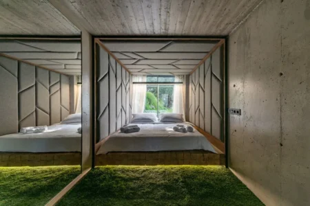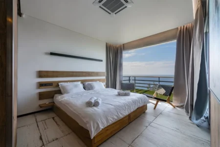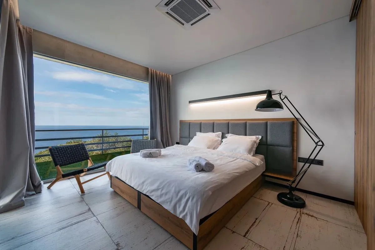The upper floor hosts four generously proportioned en-suite bedrooms, each enjoying uninterrupted sea views through minimal-frame glazing and direct access to the pool and relaxation areas.