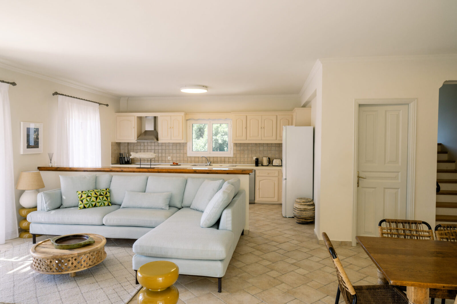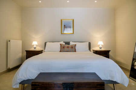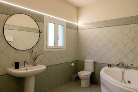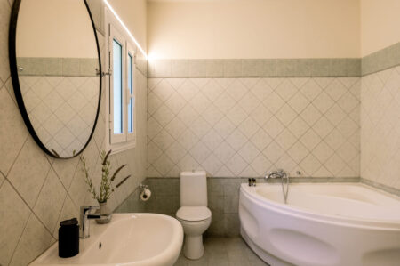 Upstairs, two elegant bedrooms await, offering peace and privacy. The highlight is the large bathroom with Jacuzzi, a perfect retreat after sun-filled days and one more guest WC. Step out onto the balcony and let your eyes wander across the sparkling Ionian Sea—a view that never fails to inspire.